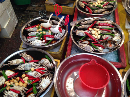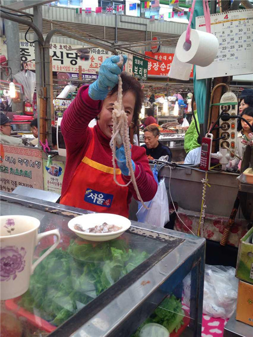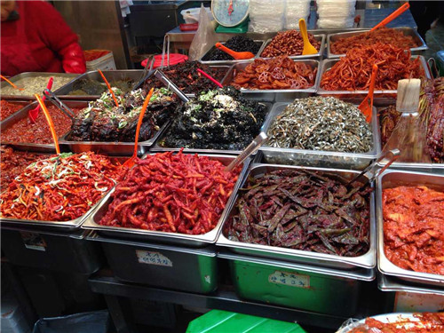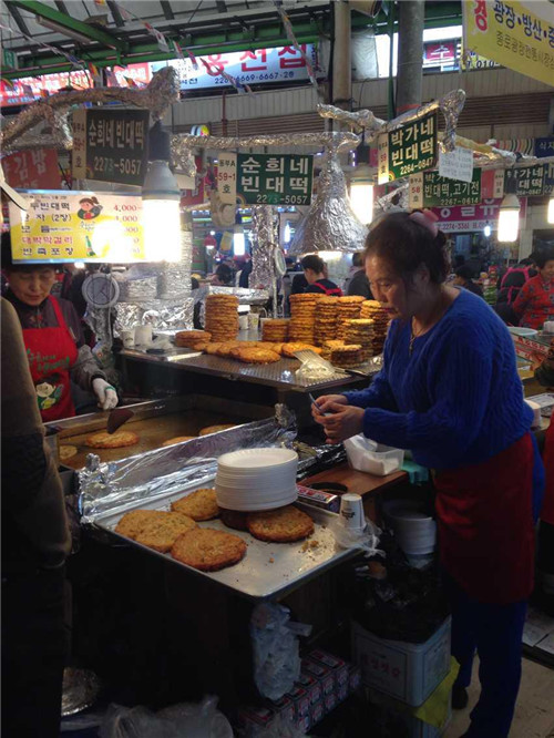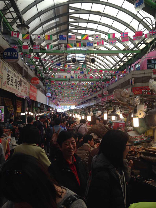 隨后在導(dǎo)游的帶領(lǐng)下前往廣藏市場。首爾的廣藏市場,是韓國國內(nèi)規(guī)模最大的市場了,作為市場控,這里又是一個必到之處。廣藏市場的歷史可以追溯到1904年,這里就像是我們國內(nèi)的自由市場一樣,賣的東西五花八門,從服裝鞋帽到日用百貨應(yīng)有盡有,而最熱鬧的要數(shù)小吃攤,現(xiàn)做現(xiàn)賣的風(fēng)味小吃最受食客們的歡迎,據(jù)說到了深夜也摩肩接踵,絡(luò)繹不絕呢!深受國內(nèi)熱播真人秀節(jié)目“奔跑吧兄弟”影響,同事們走走停停,嘗了各種地道美食,解決了我們的晚飯。