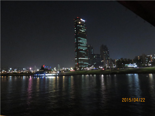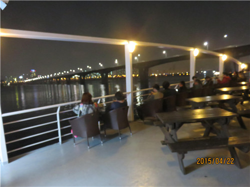 晚上8點,我們登上《星你》劇中女星盧素英舉行婚禮的豪華游輪,也就是都敏俊第一次不小心KISS了千頌伊的地方。首先,我們進行了一場面包制作DIY體驗。一團面球在同事們的巧手下包上紅豆餡押上各種造型送進烤箱等待約30分鐘的烘烤。出爐前的時間導(dǎo)游帶領(lǐng)大家搭乘游覽船游漢江。