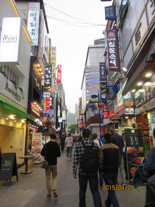 吃完晚餐,我們徒步走往東大門綜合市場。此地聚集有百貨、食品、書籍、家電用品等生活必需品,即一個整體性的批發(fā)市場,商品眾多豐富且價格優(yōu)惠。又是韓國代表性的購物街,不僅可以購買服裝、鞋類、雜貨和化妝品,還有各種飲食店云集于此。在廣場的大帳棚內(nèi)的“帳棚攤子”,有許多韓國的風(fēng)味小吃,令人垂涎三尺,同事們在此享用美食及享受購物樂趣。