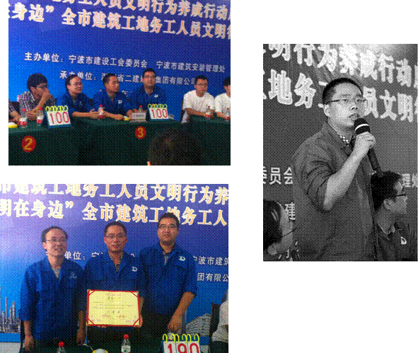 | 由寧波市建設(shè)工會(huì)委員會(huì)和寧波市建筑安裝管理處主辦的“文明在身邊”全市建筑工地務(wù)工人員文明行為知識(shí)競(jìng)賽于2013年5月23日、24日在浙江省二建的中國(guó)建設(shè)銀行寧波分行新綜合業(yè)務(wù)大樓項(xiàng)目部舉行。 23日下午,我公司鄔本福、吳文達(dá)、吳洪波組成的代表隊(duì)參加了預(yù)賽,并以小組第二的成績(jī)進(jìn)入24日下午進(jìn)行的決賽,在24日的決賽中,我集團(tuán)代表從容不迫、敢搶敢答,最終獲得該次知識(shí)競(jìng)賽的二等獎(jiǎng),為集團(tuán)公司爭(zhēng)得了榮譽(yù)! 此次競(jìng)賽獲獎(jiǎng)單位分別為: 一等獎(jiǎng):浙江省二建 二等獎(jiǎng):寧波市政、大榮集團(tuán) 三等獎(jiǎng):寧波建設(shè)、寧波住宅、寧波建工 下圖為比賽現(xiàn)場(chǎng): |