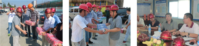 ———區(qū)建管處慰問我公司項(xiàng)目部 年年有高溫,今年高溫特別長。40℃以上的高溫連續(xù)的出現(xiàn),氣溫歷史新高的不斷突破,使得建筑工地上的民工兄弟們無法正常開展工作。我公司根據(jù)上級主管部門的相關(guān)文件精神,及時調(diào)整作息時間以及要求項(xiàng)目部配備防暑降溫藥品并發(fā)放到各班組成員。 2013年8月9日上午,鄞州區(qū)建管處的項(xiàng)主任、鐘主任帶領(lǐng)相關(guān)人員,帶著慰問品,冒著高溫酷暑,趕赴我公司承建的鄞州區(qū)下應(yīng)商務(wù)中心及首南街道九曲二期項(xiàng)目部,慰問高溫時節(jié)還奮戰(zhàn)在施工一線的工作人員,向工人們送上了清涼飲料及避暑用品,并向工地全體管理、施工人員表達(dá)了誠摯的問候和敬意。慰問結(jié)束之后,他們還分別檢查了食堂、餐廳衛(wèi)生情況、工人宿舍條件,要求我們公司及項(xiàng)目部一定要做好工地防暑降溫的具體工作,要落實(shí)專人進(jìn)行管理,強(qiáng)調(diào)高溫季節(jié)作業(yè)時間必須按照文件精神,調(diào)整工序,減少露天作業(yè)時間,做好防暑降溫工作和飲食衛(wèi)生工作,防止因高溫天氣引發(fā)工人中暑、食物中毒和各類生產(chǎn)安全事故,切實(shí)保障一線施工人員的安全和健康。