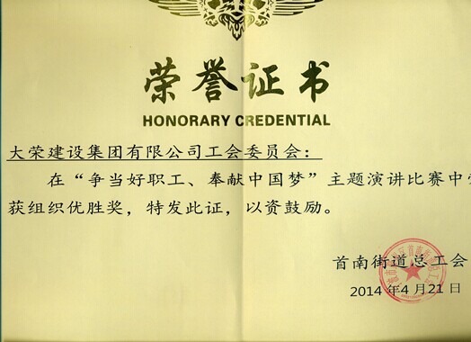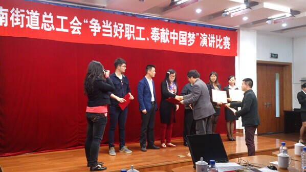2014年4月21日,我公司員工張柳雅、陳旻龍、吳曉云代表公司參加由首南街道總工會(huì)組織的“爭(zhēng)當(dāng)好職工、奉獻(xiàn)中國(guó)夢(mèng)”主題演講比賽,并取得了一個(gè)三等獎(jiǎng),兩個(gè)優(yōu)勝獎(jiǎng)的好成績(jī),同時(shí)大榮建設(shè)集團(tuán)有限公司還被街道總工會(huì)評(píng)為“爭(zhēng)當(dāng)好職工、奉獻(xiàn)中國(guó)夢(mèng)”主題演講比賽組織優(yōu)勝獎(jiǎng)的榮譽(yù)稱號(hào)。